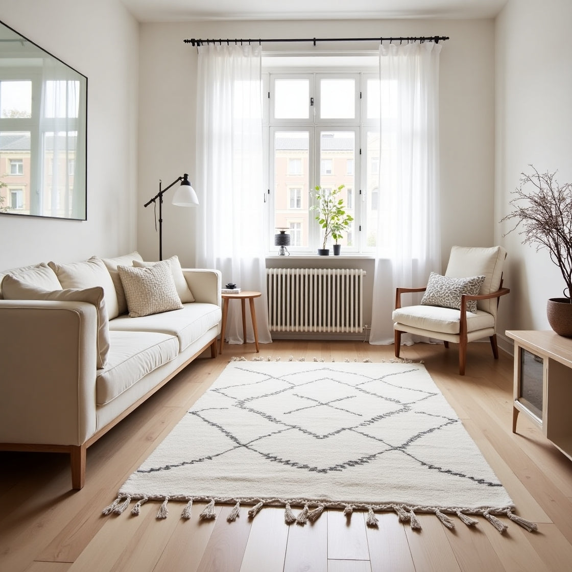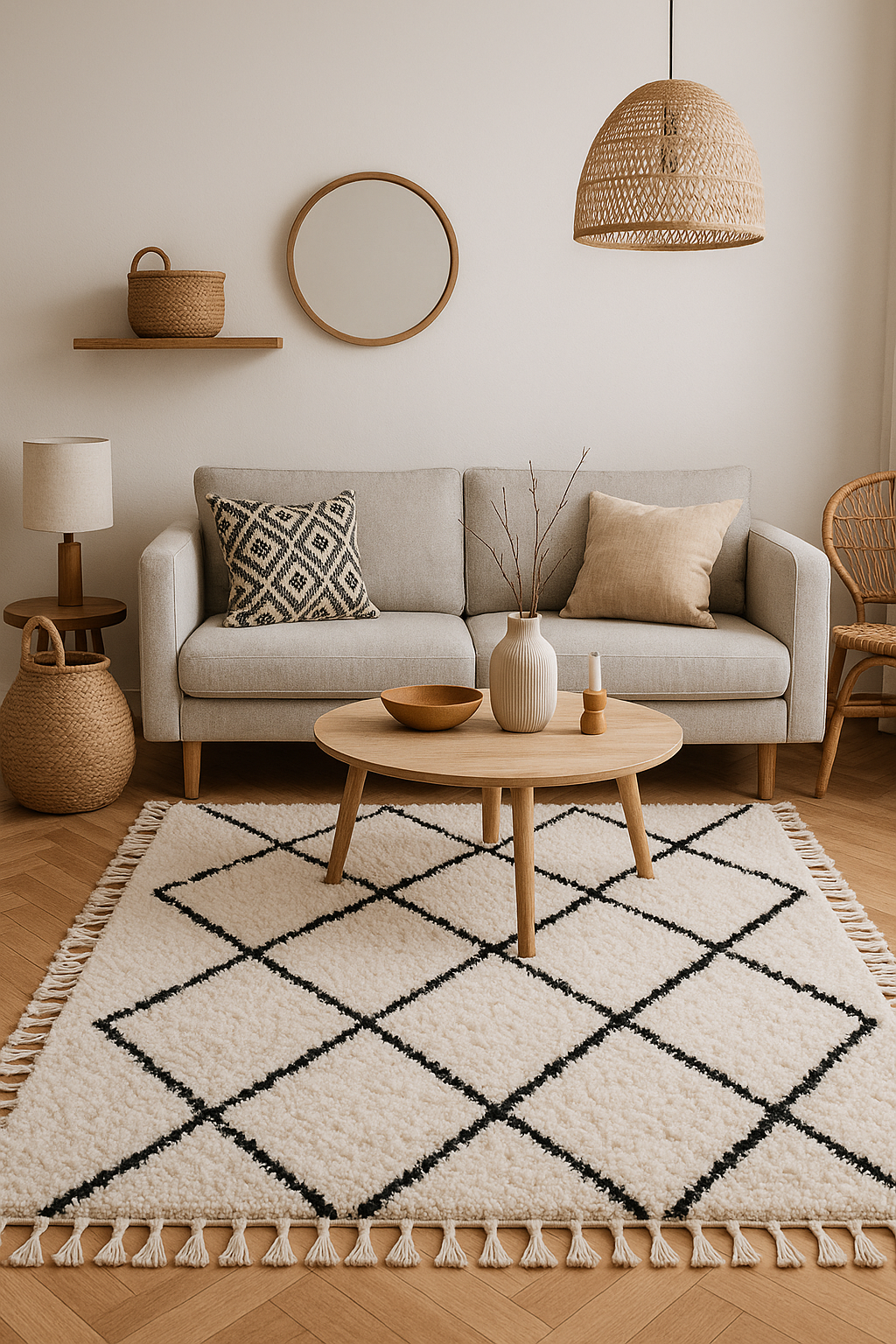 Jeder Teppich wird in liebevoller Handarbeit gefertigt und ist ein echtes Unikat.Das ikonische Rautenmuster bringt zeitlose Eleganz in dein Zuhause – natürlich, stilvoll, individuell.